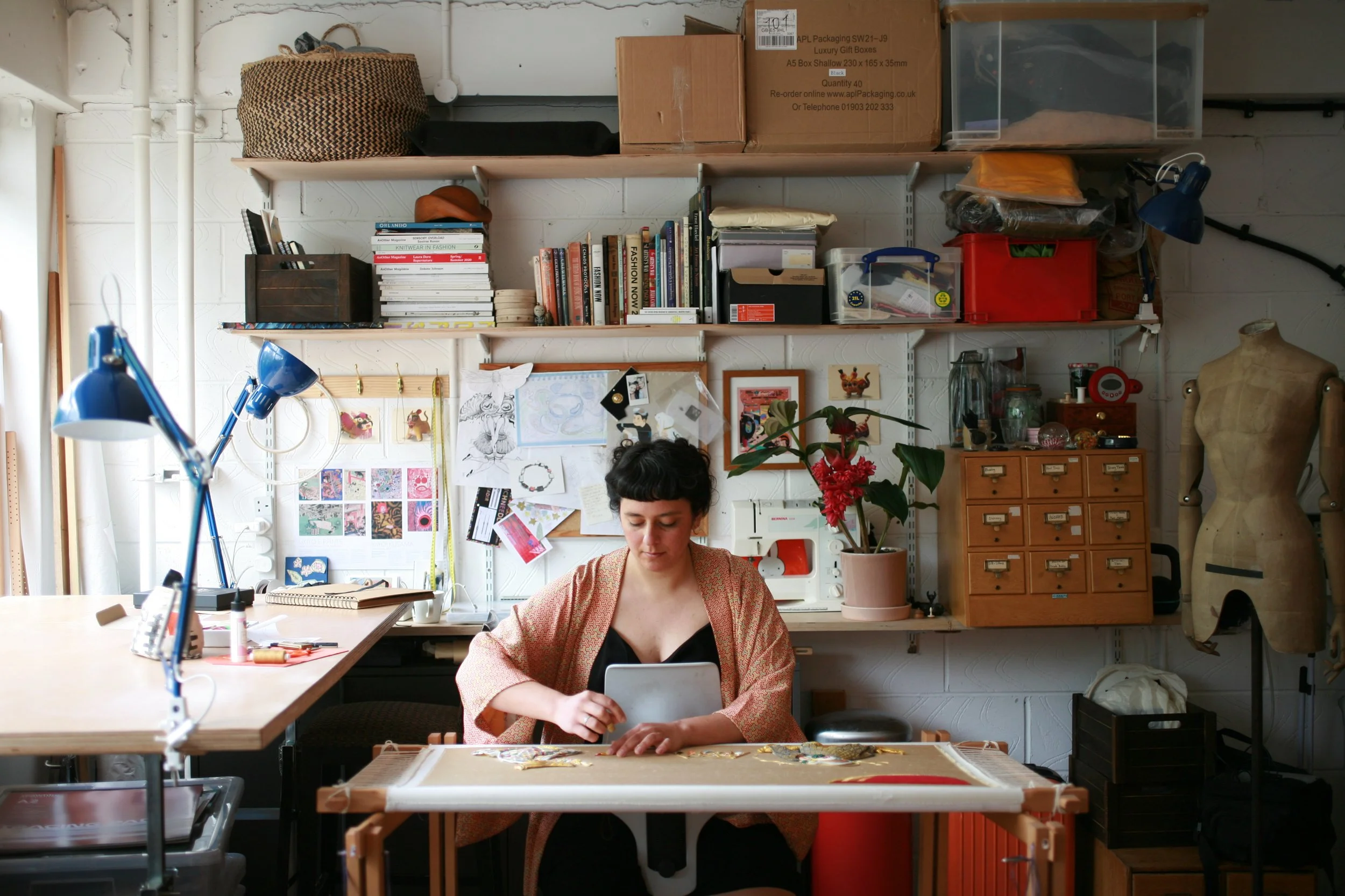 In 2016, Annalisa won the Hand & Lock Prize for Fashion and was awarded for excellence in Goldwork by the Worshipful Company of Gold and Silver Wyre Drawers. She has an ongoing relationship with the GSWDs, notably participating in their group exhibition Drawn and Formed at the Goldsmiths’ Centre. She has also worked with renowned mural artist Lauren Young Smith, translating her illustrations into embroidery. For ten years, she has honed a distinctive technical approach to her craft, informed by skills gained from her background as a costume maker. She has since worked in adaptable roles with artists and companies to produce textiles and props, including Rebecca Strickson and Watts & Co. London.