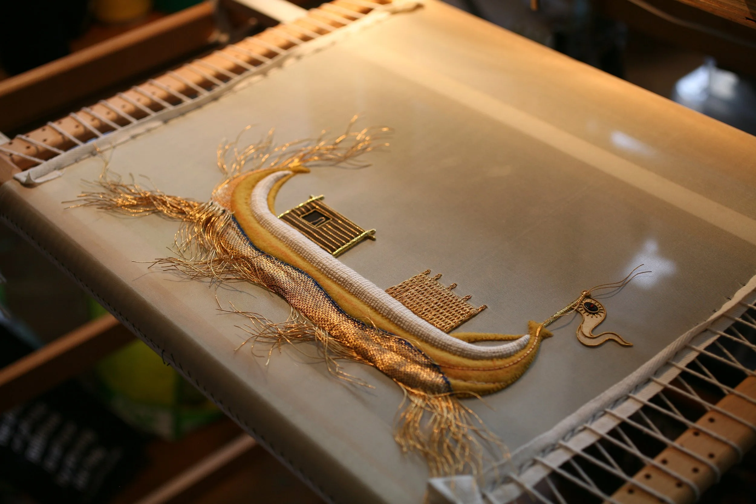 Annalisa Middleton is a London based artist who works with textiles and the spoken/written word. She writes philosophies and poetry influenced by different spiritual traditions, including Hermeticism. She has a studio at Cockpit Arts Deptford, where she specialises in making Goldwork embroidery; the art of applying metal threads and wires to fabric to achieve a sculptural effect. The craft is over 1,000 years old and is synonymous with ecclesiastical art. She works reverently with gold and coloured silks to produce graphic fine artworks, depicting sumptuous coiling creatures and richly dressed anthropomorphic characters, creating scenes she describes as contemporary embroidered mythologies. She carries the principles of making sacred art within her practice: the creation of hallowed objects that evoke a sense of awe and communion.
